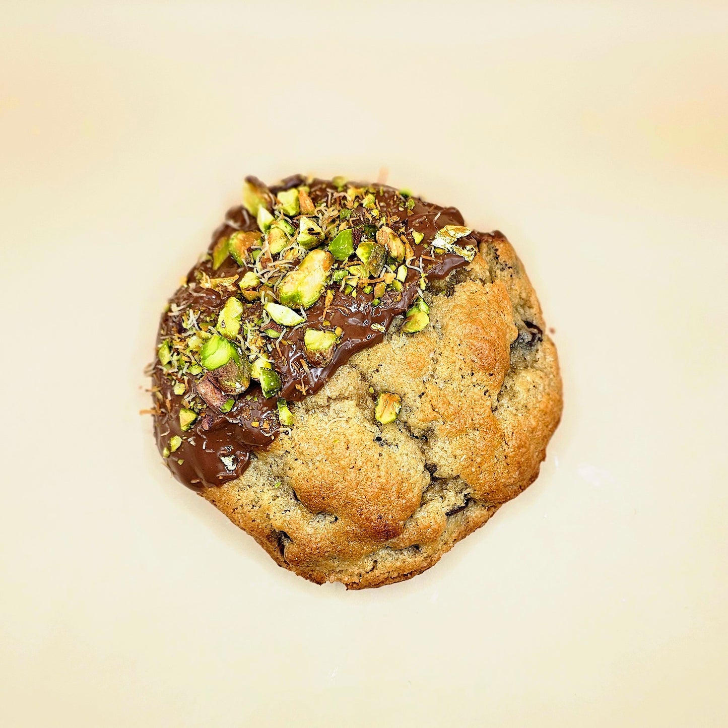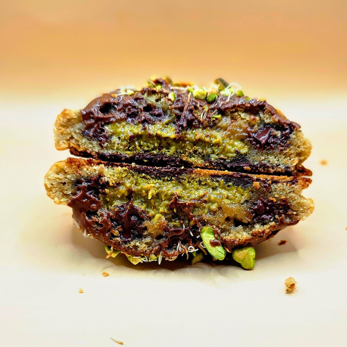 Vanilla dough chocolate chip stuffed with our signature pistachio butter, kataifi and Tahiti topped with more pistachios and milk chocolate.